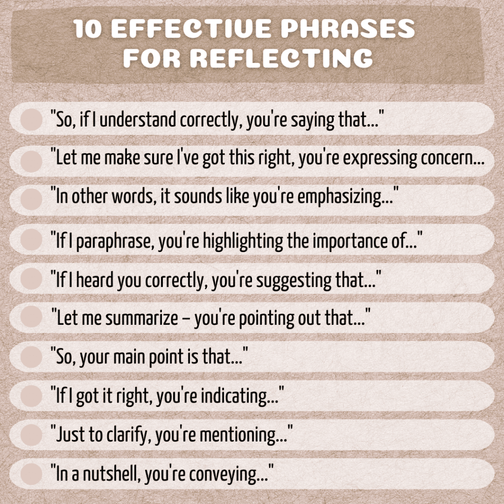 - Demonstration of interest and respect: Reflecting back the message shows that you are genuinely interested in what the other person is saying. It’s a demonstration of respect for their perspective and a commitment to understanding their viewpoint. It shows that you are making an effort to understand their thoughts and feelings.