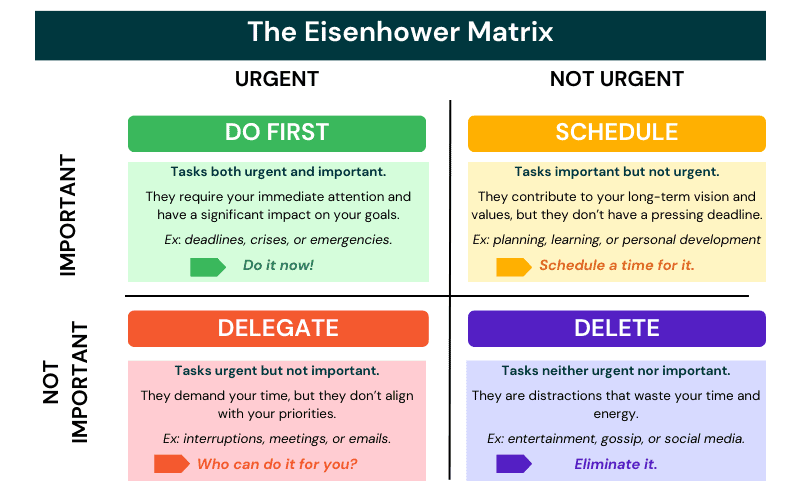 1. I recommend starting with the Eisenhower Matrix, a powerful prioritization method.